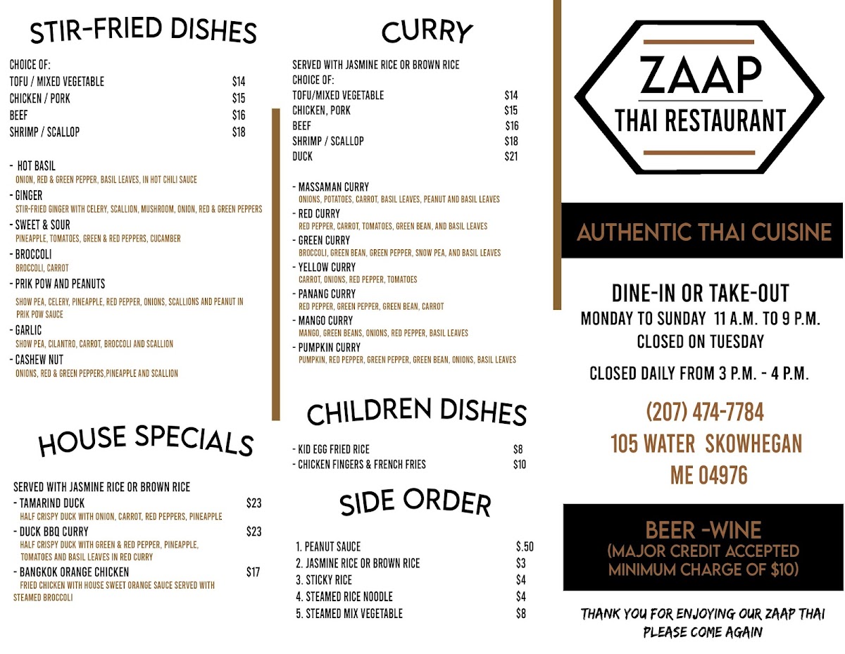 Welcome to ZAAP Skowhegan, a hidden gem nestled at 105 Water St, Skowhegan, ME. This Thai restaurant has captured the hearts of locals and visitors alike, offering a delightful escape into authentic flavors and warm hospitality. The menu is a celebration of fresh ingredients and bold spices, making it a favorite for dishes like pad Thai and Thai dumplings.